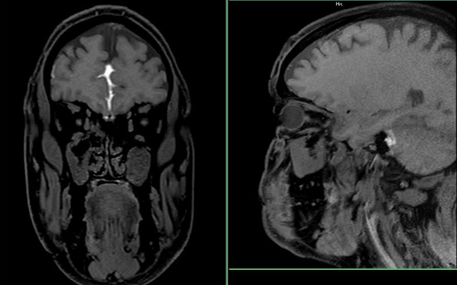 - CSF Leak Assessment: No continuous T1 hyperintense CSF tract was identified extending from the basal subarachnoid spaces across the cribriform plate or central skull base into the sinonasal cavity.